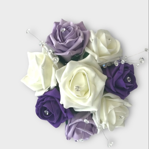 Artificial Medium Bridesmaid Bouquet Posy Crystals – made with stunning ivory or white foam rose with two additional rose colour of your choice, finished with added crystals sprays and crystal pins in the centres of all the roses. Handmade in the UK by our family team, dedicated to making your wedding day perfect with our stunning artificial wedding flowers.