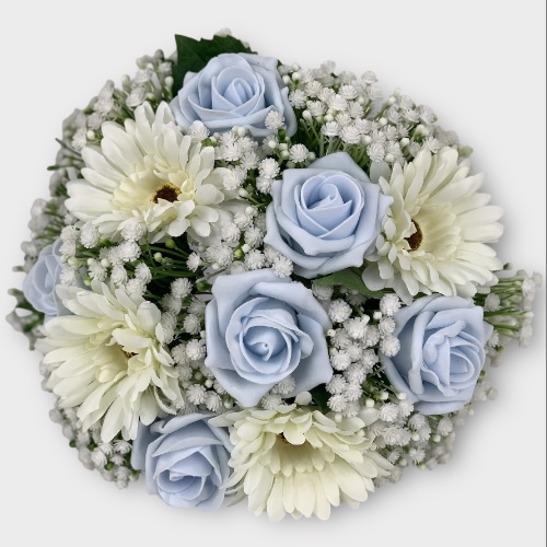 Artificial Brides Posy – Round , made with stunning ivory Gerberas and coloured foam roses, finished with added gypsophila with leaves.Hand tie handle with coloured satin ribbon . Handmade in the UK by our family team, dedicated to making your wedding day perfect with our stunning artificial wedding flowers.